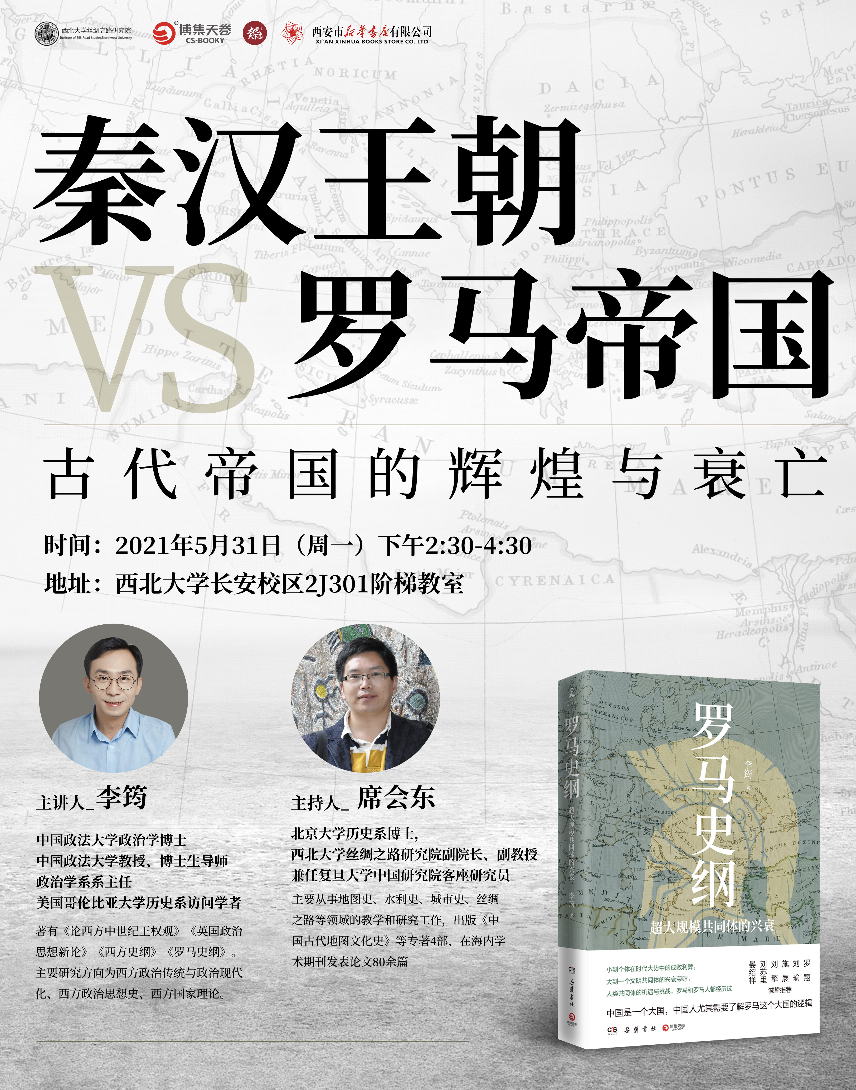 讲座预告:秦汉王朝VS罗马帝国:古代帝国的辉煌与衰亡 作者: 编辑:叶苗 时间:2021-05-30 时间:2021年5月31号(周一)下午2:30-4:30 地点:广发在线手机版(大中国区)长安校区2J301 主讲人:李筠 中国政法大学教授 主持人:席会东 广发在线手机版(大中国区)丝绸之路研究院副教授
