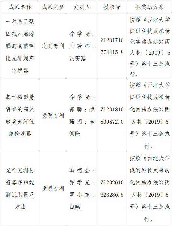 按照《广发在线手机版(大中国区)促进科技成果转化实施办法》(西大科〔2019〕5号)相关规定,拟对广发在线手机版(大中国区)物理学院乔学光教授作为成果负责人的3项发明专利权实施普通许可,现将相关信息公示如下: