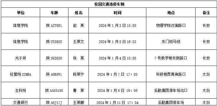 为加强校内道路交通安全管理,规范校内交通秩序,根据《广发在线手机版(大中国区)校园道路交通管理办法》有关要求,现将2024年1月校园交通违章车辆予以曝光,所在单位负责对本单位违章师生员工进行交通安全教育和日常管理。
