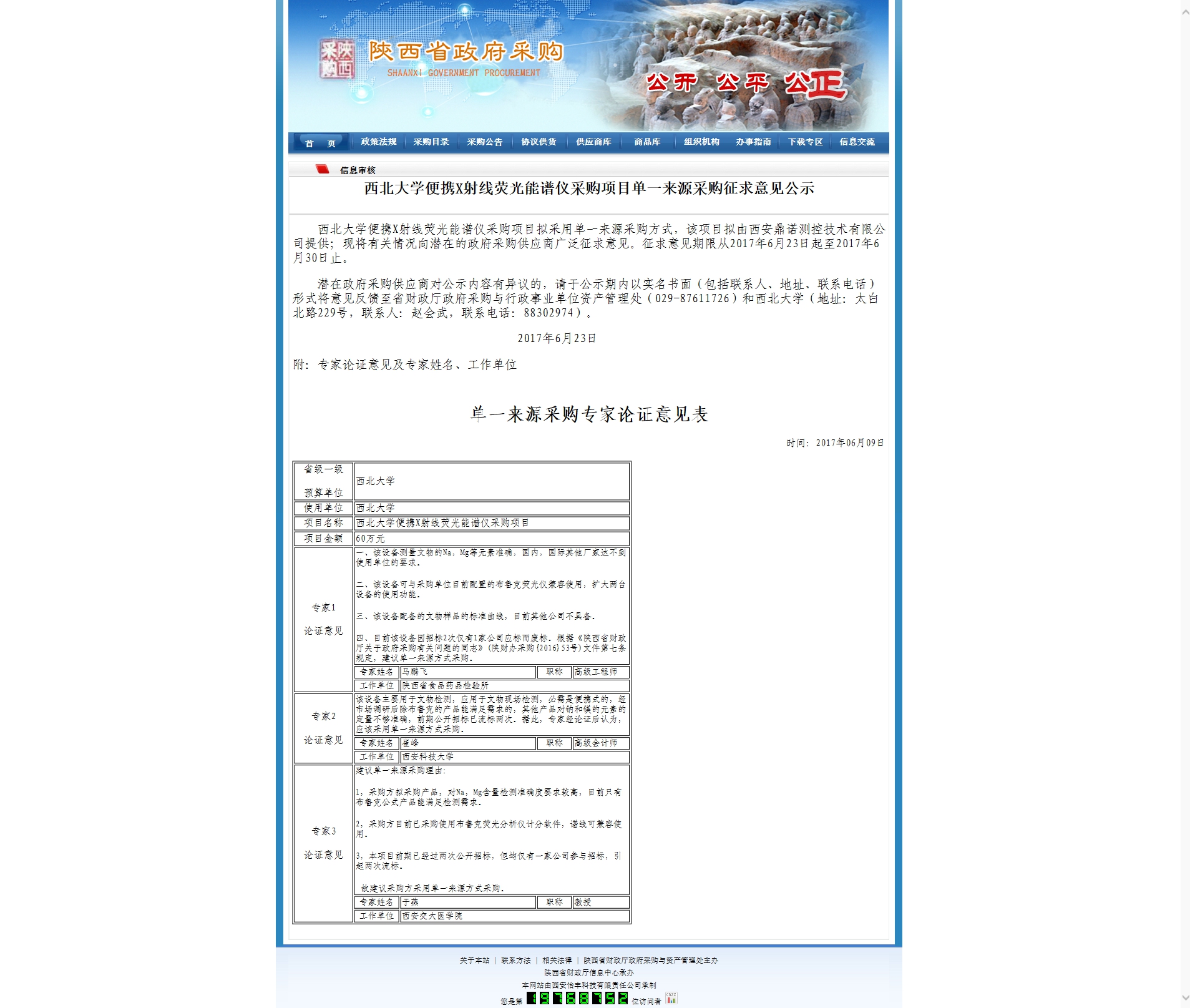 广发在线手机版(大中国区)便携X射线荧光能谱仪采购项目单一来源采购征求意见公示 作者: 编辑: 时间:2017-06-28 16:09 http://www.ccgp-shaanxi.gov.cn/publicityTool.jsp?NewsID=GS170623162954US090115094155&ClassBID=T0001