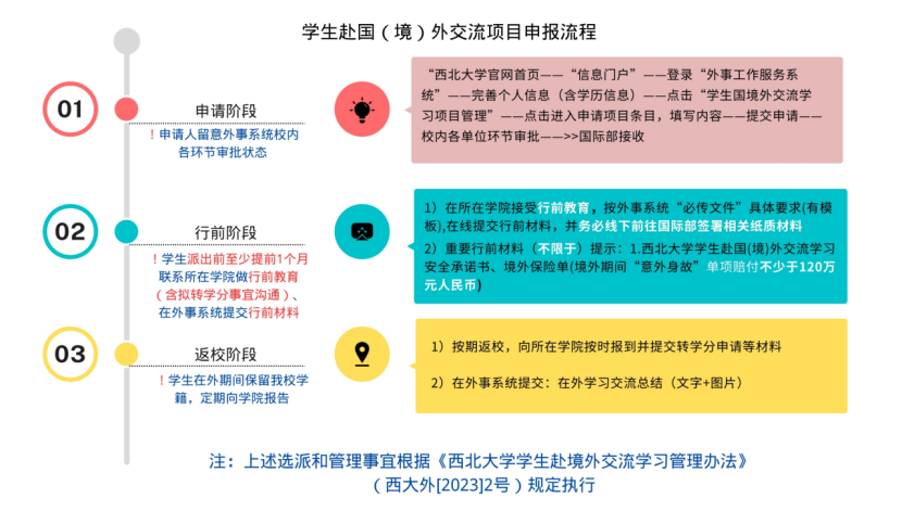 4. 申请学生在确定录取后,应及时履行出国(境)前相关行前手续。请务了解有关本项目学生的申请、行前、返校阶段情况说明,请见下图说明。